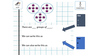 In Maths, we have introduced our new unit on Multiplication and Division. This week we are looking at equal groups, including how to make equal groups, describing them and adding them. We are also introducing the multiplication symbol to represent how many groups we have, the value of each group and the total. For example: