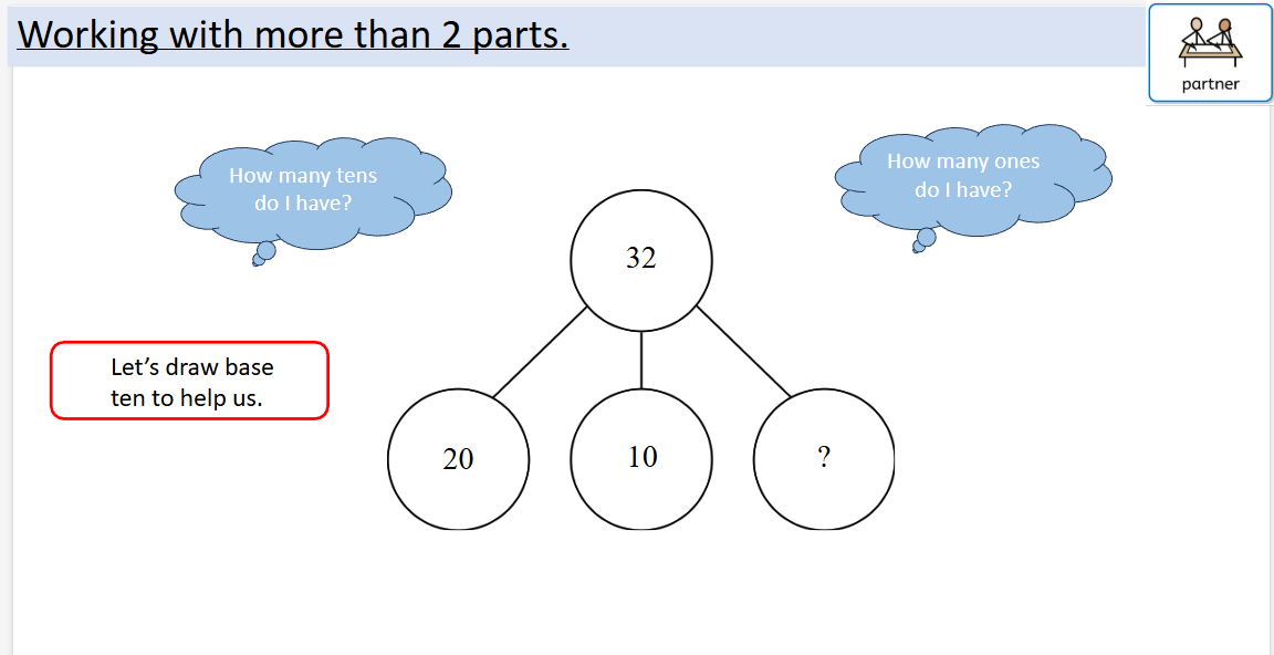 In Maths, we have finished our Place Value focus for this half-term. We have focussed on looking at how numbers are constructed using part-part-whole models. The children have looked at partitioning numbers into 10s and 1s and also into 3 separate ways to deepen their understanding. Please see the examples below for reference: