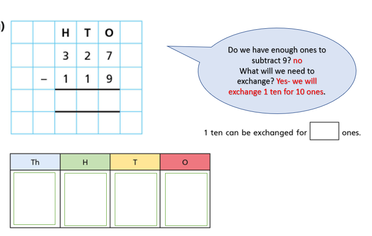 In Maths, we have been working on subtraction and will include those which require an exchange in tomorrow's lesson. See the examples below. Your children should be able to explain how to use the place value chart. They will bring home a completed example on Friday for you to see.