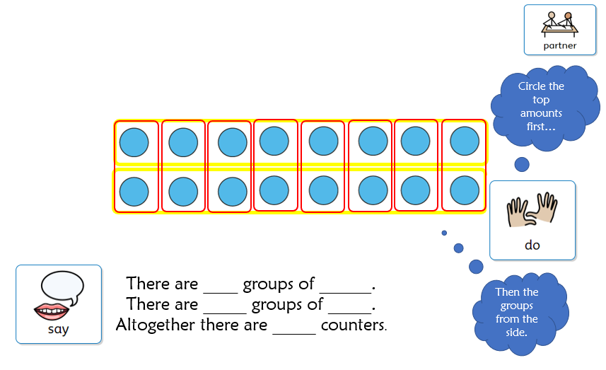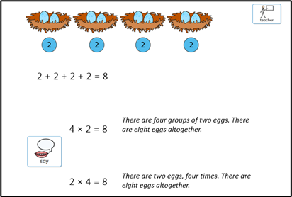 In Maths, we have introduced our new unit on Multiplication and Division. This week we are looking at equal groups, including how to make equal groups, describing them and adding them. We are also introducing the multiplication symbol to represent how many groups we have, the value of each group and the total. For example,