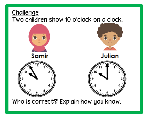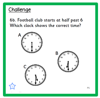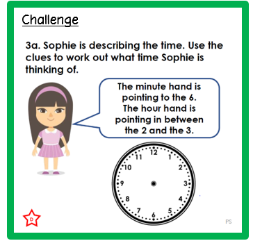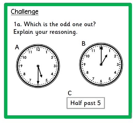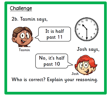 In Maths, we are focusing on telling the time to half past. The challenges below encourage children to give reasoning to prove their answer!