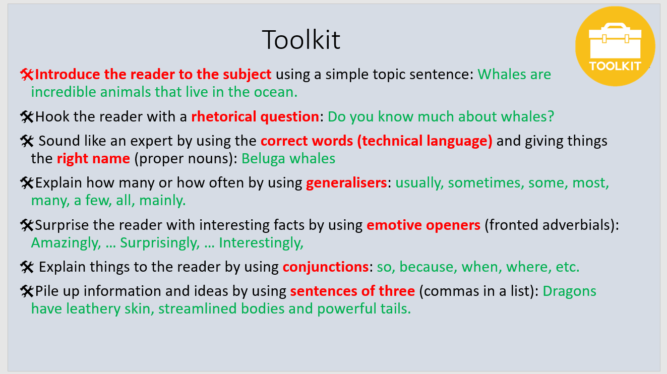 In English, the children have written their information text all about their own dragon! Throughout the unit we have focused on our writing toolkit, with features specific to our text type. The toolkit for this writing includes –