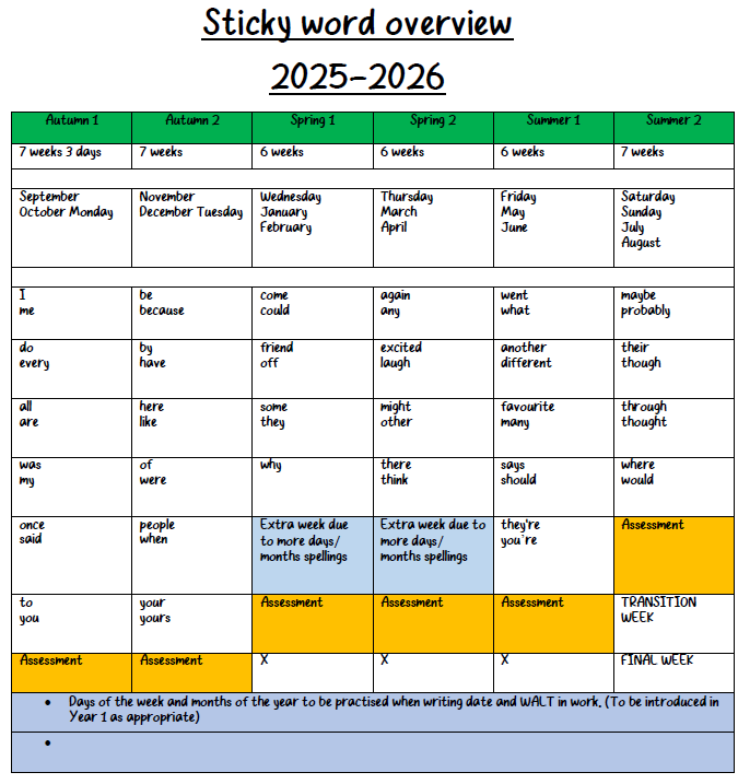 In Year 1 we will learn new sticky words each week. At the end of the half term, the children will be assessed on writing these without any prompts. We will teach and practise these in class, but it would be wonderful if you could support your child with these at home also.